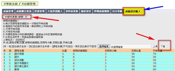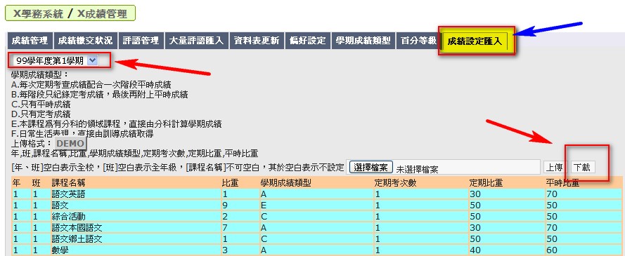 可以先將其他學期的設定下載修改後再上傳設定新學期